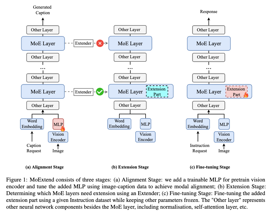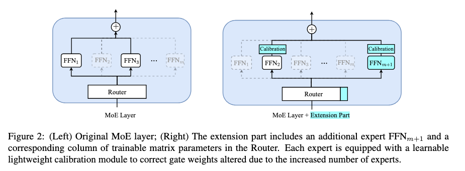 - randomly sample 10k instruction data related to the new modality as the validation set, with the remaining data forming the sub-training set. The sub-training set is used to train the extender, and then evaluate the new and old model on the validation set, analyzing which layers are most sensitive to the new modality. The new expert is copied from the expert within the layer that reacted most to the new modality, and the router is extended.